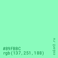 Цвет #89FBBC в цветовой модели RGB обозначается тремя октетами (137, 251, 188) в десятичном формате и #89FBBC в шестнадцатиричном (hex) формате, которые являются интенсивностью красного 137 (hex 89), интенсивность зелёного 251 (hex FB) и интенсивность синего 188 (hex BC).