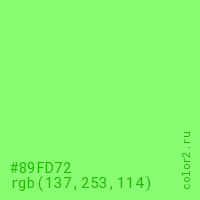 Цвет #89FD72 в цветовой модели RGB обозначается тремя октетами (137, 253, 114) в десятичном формате и #89FD72 в шестнадцатиричном (hex) формате, которые являются интенсивностью красного 137 (hex 89), интенсивность зелёного 253 (hex FD) и интенсивность синего 114 (hex 72).