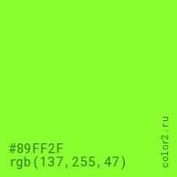 Цвет #89FF2F в цветовой модели RGB обозначается тремя октетами (137, 255, 47) в десятичном формате и #89FF2F в шестнадцатиричном (hex) формате, которые являются интенсивностью красного 137 (hex 89), интенсивность зелёного 255 (hex FF) и интенсивность синего 47 (hex 2F).