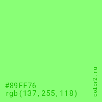 Цвет #89FF76 в цветовой модели RGB обозначается тремя октетами (137, 255, 118) в десятичном формате и #89FF76 в шестнадцатиричном (hex) формате, которые являются интенсивностью красного 137 (hex 89), интенсивность зелёного 255 (hex FF) и интенсивность синего 118 (hex 76).