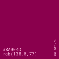 Цвет #8A004D в цветовой модели RGB обозначается тремя октетами (138, 0, 77) в десятичном формате и #8A004D в шестнадцатиричном (hex) формате, которые являются интенсивностью красного 138 (hex 8A), интенсивность зелёного 0 (hex 00) и интенсивность синего 77 (hex 4D).