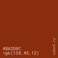 Цвет #8A2D0C в цветовой модели RGB обозначается тремя октетами (138, 45, 12) в десятичном формате и #8A2D0C в шестнадцатиричном (hex) формате, которые являются интенсивностью красного 138 (hex 8A), интенсивность зелёного 45 (hex 2D) и интенсивность синего 12 (hex 0C).