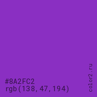 Цвет #8A2FC2 в цветовой модели RGB обозначается тремя октетами (138, 47, 194) в десятичном формате и #8A2FC2 в шестнадцатиричном (hex) формате, которые являются интенсивностью красного 138 (hex 8A), интенсивность зелёного 47 (hex 2F) и интенсивность синего 194 (hex C2).