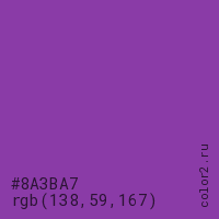 Цвет #8A3BA7 в цветовой модели RGB обозначается тремя октетами (138, 59, 167) в десятичном формате и #8A3BA7 в шестнадцатиричном (hex) формате, которые являются интенсивностью красного 138 (hex 8A), интенсивность зелёного 59 (hex 3B) и интенсивность синего 167 (hex A7).