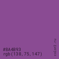 Цвет #8A4B93 в цветовой модели RGB обозначается тремя октетами (138, 75, 147) в десятичном формате и #8A4B93 в шестнадцатиричном (hex) формате, которые являются интенсивностью красного 138 (hex 8A), интенсивность зелёного 75 (hex 4B) и интенсивность синего 147 (hex 93).