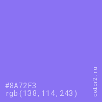 Цвет #8A72F3 в цветовой модели RGB обозначается тремя октетами (138, 114, 243) в десятичном формате и #8A72F3 в шестнадцатиричном (hex) формате, которые являются интенсивностью красного 138 (hex 8A), интенсивность зелёного 114 (hex 72) и интенсивность синего 243 (hex F3).