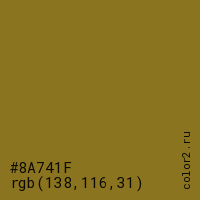 Цвет #8A741F в цветовой модели RGB обозначается тремя октетами (138, 116, 31) в десятичном формате и #8A741F в шестнадцатиричном (hex) формате, которые являются интенсивностью красного 138 (hex 8A), интенсивность зелёного 116 (hex 74) и интенсивность синего 31 (hex 1F).