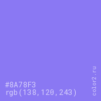 Цвет #8A78F3 в цветовой модели RGB обозначается тремя октетами (138, 120, 243) в десятичном формате и #8A78F3 в шестнадцатиричном (hex) формате, которые являются интенсивностью красного 138 (hex 8A), интенсивность зелёного 120 (hex 78) и интенсивность синего 243 (hex F3).