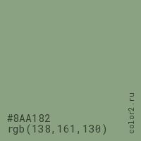 Цвет #8AA182 в цветовой модели RGB обозначается тремя октетами (138, 161, 130) в десятичном формате и #8AA182 в шестнадцатиричном (hex) формате, которые являются интенсивностью красного 138 (hex 8A), интенсивность зелёного 161 (hex A1) и интенсивность синего 130 (hex 82).