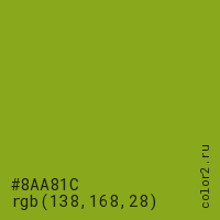 Цвет #8AA81C в цветовой модели RGB обозначается тремя октетами (138, 168, 28) в десятичном формате и #8AA81C в шестнадцатиричном (hex) формате, которые являются интенсивностью красного 138 (hex 8A), интенсивность зелёного 168 (hex A8) и интенсивность синего 28 (hex 1C).