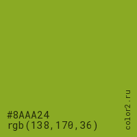 Цвет #8AAA24 в цветовой модели RGB обозначается тремя октетами (138, 170, 36) в десятичном формате и #8AAA24 в шестнадцатиричном (hex) формате, которые являются интенсивностью красного 138 (hex 8A), интенсивность зелёного 170 (hex AA) и интенсивность синего 36 (hex 24).