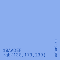 Цвет #8AADEF в цветовой модели RGB обозначается тремя октетами (138, 173, 239) в десятичном формате и #8AADEF в шестнадцатиричном (hex) формате, которые являются интенсивностью красного 138 (hex 8A), интенсивность зелёного 173 (hex AD) и интенсивность синего 239 (hex EF).