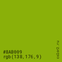 Цвет #8AB009 в цветовой модели RGB обозначается тремя октетами (138, 176, 9) в десятичном формате и #8AB009 в шестнадцатиричном (hex) формате, которые являются интенсивностью красного 138 (hex 8A), интенсивность зелёного 176 (hex B0) и интенсивность синего 9 (hex 09).