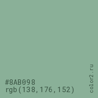 Цвет #8AB098 в цветовой модели RGB обозначается тремя октетами (138, 176, 152) в десятичном формате и #8AB098 в шестнадцатиричном (hex) формате, которые являются интенсивностью красного 138 (hex 8A), интенсивность зелёного 176 (hex B0) и интенсивность синего 152 (hex 98).