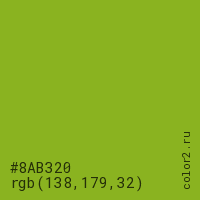 Цвет #8AB320 в цветовой модели RGB обозначается тремя октетами (138, 179, 32) в десятичном формате и #8AB320 в шестнадцатиричном (hex) формате, которые являются интенсивностью красного 138 (hex 8A), интенсивность зелёного 179 (hex B3) и интенсивность синего 32 (hex 20).