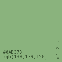 Цвет RGB(138, 179, 125) в процентом отношении количества цвета состоит из 54.1% красного (red), 70.2% зелёного (green) и 49% синего (blue).