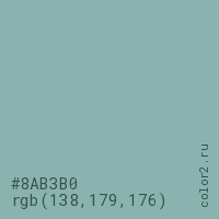 Цвет #8AB3B0 в цветовой модели RGB обозначается тремя октетами (138, 179, 176) в десятичном формате и #8AB3B0 в шестнадцатиричном (hex) формате, которые являются интенсивностью красного 138 (hex 8A), интенсивность зелёного 179 (hex B3) и интенсивность синего 176 (hex B0).