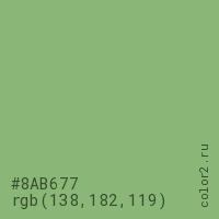 Цвет #8AB677 в цветовой модели RGB обозначается тремя октетами (138, 182, 119) в десятичном формате и #8AB677 в шестнадцатиричном (hex) формате, которые являются интенсивностью красного 138 (hex 8A), интенсивность зелёного 182 (hex B6) и интенсивность синего 119 (hex 77).