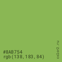 Цвет #8AB754 в цветовой модели RGB обозначается тремя октетами (138, 183, 84) в десятичном формате и #8AB754 в шестнадцатиричном (hex) формате, которые являются интенсивностью красного 138 (hex 8A), интенсивность зелёного 183 (hex B7) и интенсивность синего 84 (hex 54).