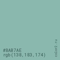 Цвет #8AB7AE в цветовой модели RGB обозначается тремя октетами (138, 183, 174) в десятичном формате и #8AB7AE в шестнадцатиричном (hex) формате, которые являются интенсивностью красного 138 (hex 8A), интенсивность зелёного 183 (hex B7) и интенсивность синего 174 (hex AE).