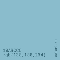 Цвет #8ABCCC в цветовой модели RGB обозначается тремя октетами (138, 188, 204) в десятичном формате и #8ABCCC в шестнадцатиричном (hex) формате, которые являются интенсивностью красного 138 (hex 8A), интенсивность зелёного 188 (hex BC) и интенсивность синего 204 (hex CC).