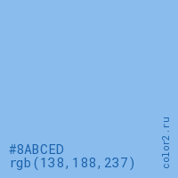 Цвет #8ABCED в цветовой модели RGB обозначается тремя октетами (138, 188, 237) в десятичном формате и #8ABCED в шестнадцатиричном (hex) формате, которые являются интенсивностью красного 138 (hex 8A), интенсивность зелёного 188 (hex BC) и интенсивность синего 237 (hex ED).