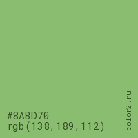 Цвет #8ABD70 в цветовой модели RGB обозначается тремя октетами (138, 189, 112) в десятичном формате и #8ABD70 в шестнадцатиричном (hex) формате, которые являются интенсивностью красного 138 (hex 8A), интенсивность зелёного 189 (hex BD) и интенсивность синего 112 (hex 70).