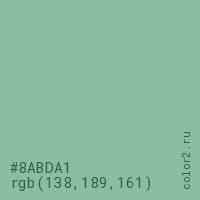 Цвет #8ABDA1 в цветовой модели RGB обозначается тремя октетами (138, 189, 161) в десятичном формате и #8ABDA1 в шестнадцатиричном (hex) формате, которые являются интенсивностью красного 138 (hex 8A), интенсивность зелёного 189 (hex BD) и интенсивность синего 161 (hex A1).