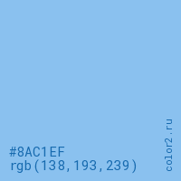 Цвет #8AC1EF в цветовой модели RGB обозначается тремя октетами (138, 193, 239) в десятичном формате и #8AC1EF в шестнадцатиричном (hex) формате, которые являются интенсивностью красного 138 (hex 8A), интенсивность зелёного 193 (hex C1) и интенсивность синего 239 (hex EF).