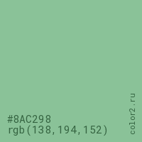 Цвет #8AC298 в цветовой модели RGB обозначается тремя октетами (138, 194, 152) в десятичном формате и #8AC298 в шестнадцатиричном (hex) формате, которые являются интенсивностью красного 138 (hex 8A), интенсивность зелёного 194 (hex C2) и интенсивность синего 152 (hex 98).