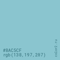 Цвет #8AC5CF в цветовой модели RGB обозначается тремя октетами (138, 197, 207) в десятичном формате и #8AC5CF в шестнадцатиричном (hex) формате, которые являются интенсивностью красного 138 (hex 8A), интенсивность зелёного 197 (hex C5) и интенсивность синего 207 (hex CF).