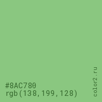 Цвет #8AC780 в цветовой модели RGB обозначается тремя октетами (138, 199, 128) в десятичном формате и #8AC780 в шестнадцатиричном (hex) формате, которые являются интенсивностью красного 138 (hex 8A), интенсивность зелёного 199 (hex C7) и интенсивность синего 128 (hex 80).