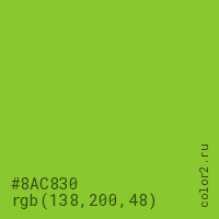 Цвет #8AC830 в цветовой модели RGB обозначается тремя октетами (138, 200, 48) в десятичном формате и #8AC830 в шестнадцатиричном (hex) формате, которые являются интенсивностью красного 138 (hex 8A), интенсивность зелёного 200 (hex C8) и интенсивность синего 48 (hex 30).