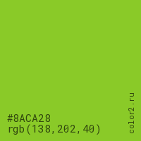 Цвет #8ACA28 в цветовой модели RGB обозначается тремя октетами (138, 202, 40) в десятичном формате и #8ACA28 в шестнадцатиричном (hex) формате, которые являются интенсивностью красного 138 (hex 8A), интенсивность зелёного 202 (hex CA) и интенсивность синего 40 (hex 28).