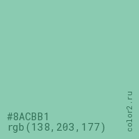 Цвет #8ACBB1 в цветовой модели RGB обозначается тремя октетами (138, 203, 177) в десятичном формате и #8ACBB1 в шестнадцатиричном (hex) формате, которые являются интенсивностью красного 138 (hex 8A), интенсивность зелёного 203 (hex CB) и интенсивность синего 177 (hex B1).