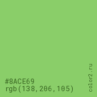 Цвет #8ACE69 в цветовой модели RGB обозначается тремя октетами (138, 206, 105) в десятичном формате и #8ACE69 в шестнадцатиричном (hex) формате, которые являются интенсивностью красного 138 (hex 8A), интенсивность зелёного 206 (hex CE) и интенсивность синего 105 (hex 69).