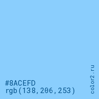 Цвет #8ACEFD в цветовой модели RGB обозначается тремя октетами (138, 206, 253) в десятичном формате и #8ACEFD в шестнадцатиричном (hex) формате, которые являются интенсивностью красного 138 (hex 8A), интенсивность зелёного 206 (hex CE) и интенсивность синего 253 (hex FD).
