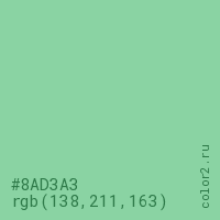 Цвет #8AD3A3 в цветовой модели RGB обозначается тремя октетами (138, 211, 163) в десятичном формате и #8AD3A3 в шестнадцатиричном (hex) формате, которые являются интенсивностью красного 138 (hex 8A), интенсивность зелёного 211 (hex D3) и интенсивность синего 163 (hex A3).