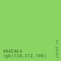 Цвет #8AD464 в цветовой модели RGB обозначается тремя октетами (138, 212, 100) в десятичном формате и #8AD464 в шестнадцатиричном (hex) формате, которые являются интенсивностью красного 138 (hex 8A), интенсивность зелёного 212 (hex D4) и интенсивность синего 100 (hex 64).