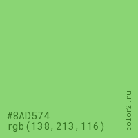 Цвет #8AD574 в цветовой модели RGB обозначается тремя октетами (138, 213, 116) в десятичном формате и #8AD574 в шестнадцатиричном (hex) формате, которые являются интенсивностью красного 138 (hex 8A), интенсивность зелёного 213 (hex D5) и интенсивность синего 116 (hex 74).
