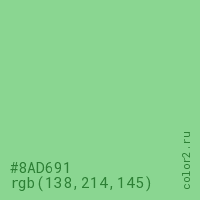 Цвет #8AD691 в цветовой модели RGB обозначается тремя октетами (138, 214, 145) в десятичном формате и #8AD691 в шестнадцатиричном (hex) формате, которые являются интенсивностью красного 138 (hex 8A), интенсивность зелёного 214 (hex D6) и интенсивность синего 145 (hex 91).