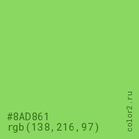 Цвет #8AD861 в цветовой модели RGB обозначается тремя октетами (138, 216, 97) в десятичном формате и #8AD861 в шестнадцатиричном (hex) формате, которые являются интенсивностью красного 138 (hex 8A), интенсивность зелёного 216 (hex D8) и интенсивность синего 97 (hex 61).