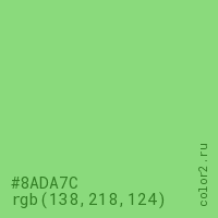 Цвет #8ADA7C в цветовой модели RGB обозначается тремя октетами (138, 218, 124) в десятичном формате и #8ADA7C в шестнадцатиричном (hex) формате, которые являются интенсивностью красного 138 (hex 8A), интенсивность зелёного 218 (hex DA) и интенсивность синего 124 (hex 7C).