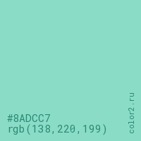 Цвет #8ADCC7 в цветовой модели RGB обозначается тремя октетами (138, 220, 199) в десятичном формате и #8ADCC7 в шестнадцатиричном (hex) формате, которые являются интенсивностью красного 138 (hex 8A), интенсивность зелёного 220 (hex DC) и интенсивность синего 199 (hex C7).