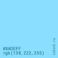 Цвет #8ADEFF в цветовой модели RGB обозначается тремя октетами (138, 222, 255) в десятичном формате и #8ADEFF в шестнадцатиричном (hex) формате, которые являются интенсивностью красного 138 (hex 8A), интенсивность зелёного 222 (hex DE) и интенсивность синего 255 (hex FF).