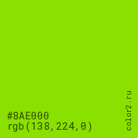 Цвет #8AE000 в цветовой модели RGB обозначается тремя октетами (138, 224, 0) в десятичном формате и #8AE000 в шестнадцатиричном (hex) формате, которые являются интенсивностью красного 138 (hex 8A), интенсивность зелёного 224 (hex E0) и интенсивность синего 0 (hex 00).