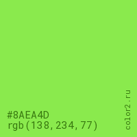 Цвет #8AEA4D в цветовой модели RGB обозначается тремя октетами (138, 234, 77) в десятичном формате и #8AEA4D в шестнадцатиричном (hex) формате, которые являются интенсивностью красного 138 (hex 8A), интенсивность зелёного 234 (hex EA) и интенсивность синего 77 (hex 4D).