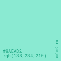 Цвет #8AEAD2 в цветовой модели RGB обозначается тремя октетами (138, 234, 210) в десятичном формате и #8AEAD2 в шестнадцатиричном (hex) формате, которые являются интенсивностью красного 138 (hex 8A), интенсивность зелёного 234 (hex EA) и интенсивность синего 210 (hex D2).