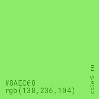 Цвет #8AEC68 в цветовой модели RGB обозначается тремя октетами (138, 236, 104) в десятичном формате и #8AEC68 в шестнадцатиричном (hex) формате, которые являются интенсивностью красного 138 (hex 8A), интенсивность зелёного 236 (hex EC) и интенсивность синего 104 (hex 68).