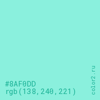 Цвет #8AF0DD в цветовой модели RGB обозначается тремя октетами (138, 240, 221) в десятичном формате и #8AF0DD в шестнадцатиричном (hex) формате, которые являются интенсивностью красного 138 (hex 8A), интенсивность зелёного 240 (hex F0) и интенсивность синего 221 (hex DD).